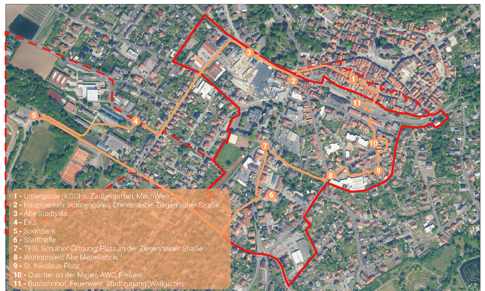Darüber hinaus wurden in mehreren Stationen wiederkehrende Themen benannt: Sanierungsbedarfe und Leerstände, insbesondere in der Untergasse und der Freiheit, fehlende oder wenig attraktive Aufenthalts- und Begegnungsorte sowie Defizite bei der Barrierefreiheit. Im Bereich Verkehr wurde auf zu hohe Geschwindigkeiten hingewiesen, etwa in der Untergasse und der Ziegenhainer Straße, mit negativen Auswirkungen auf Sicherheit und Aufenthaltsqualität. Verkehrsberuhigende Maßnahmen wurden grundsätzlich begrüßt, zugleich aber der Bedarf an zielortnahen Parkplätzen betont, insbesondere für ältere Menschen.